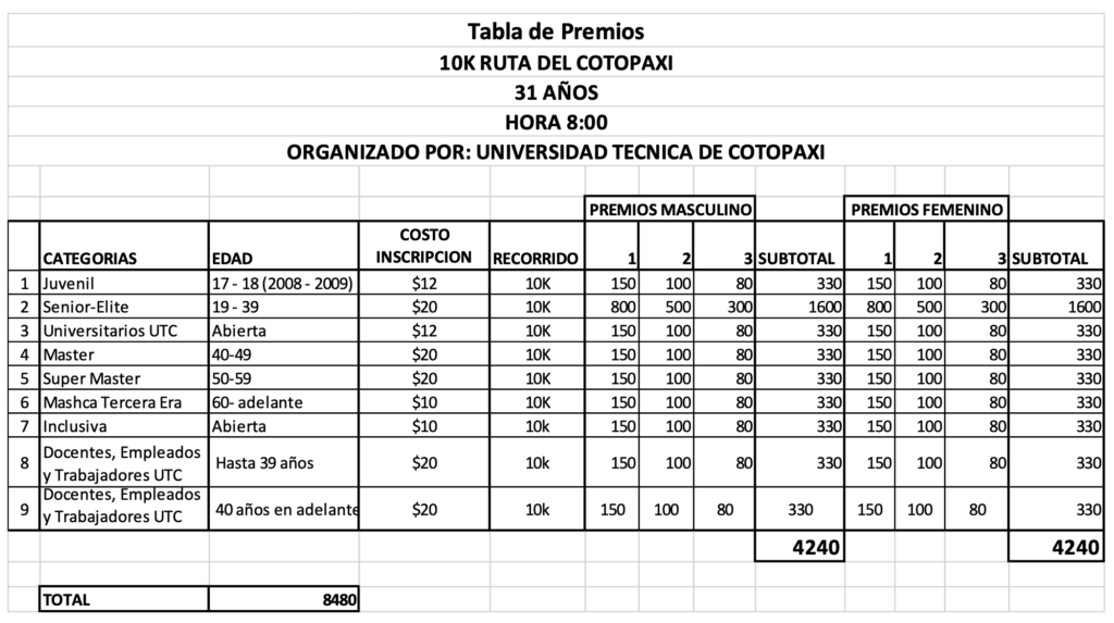 Los costos por la inscripción a la 10K Ruta Del Cotopaxi son: